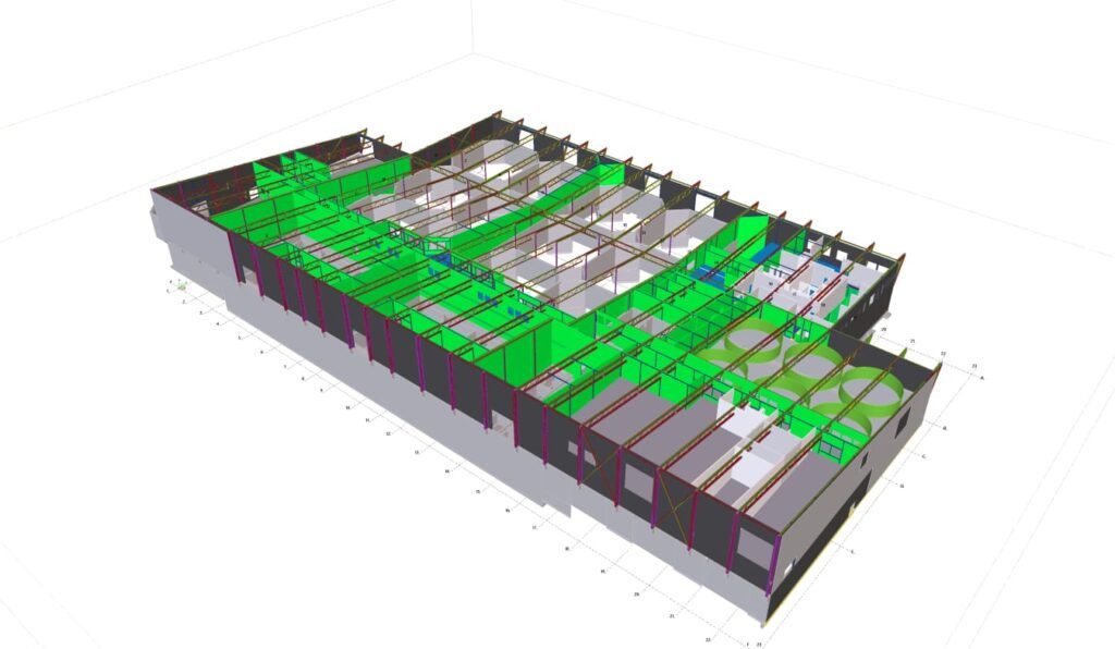 Designed by MAXWELL in 2025, this Industrial project highlights our design approach in Norway. Measuring 76m x 33.3m x 11.5m, the project incorporates Connection FEM design, Full FEM design, Production drawings, Tekla modelling to achieve the result.